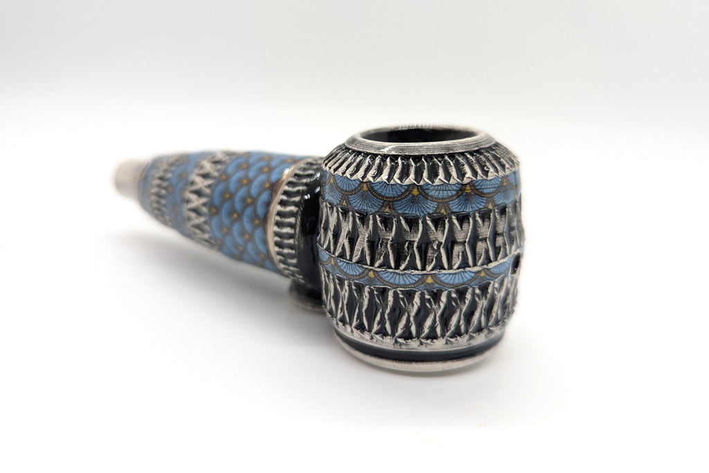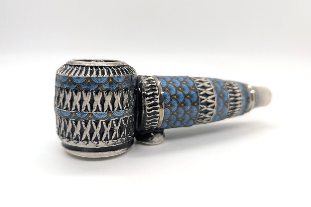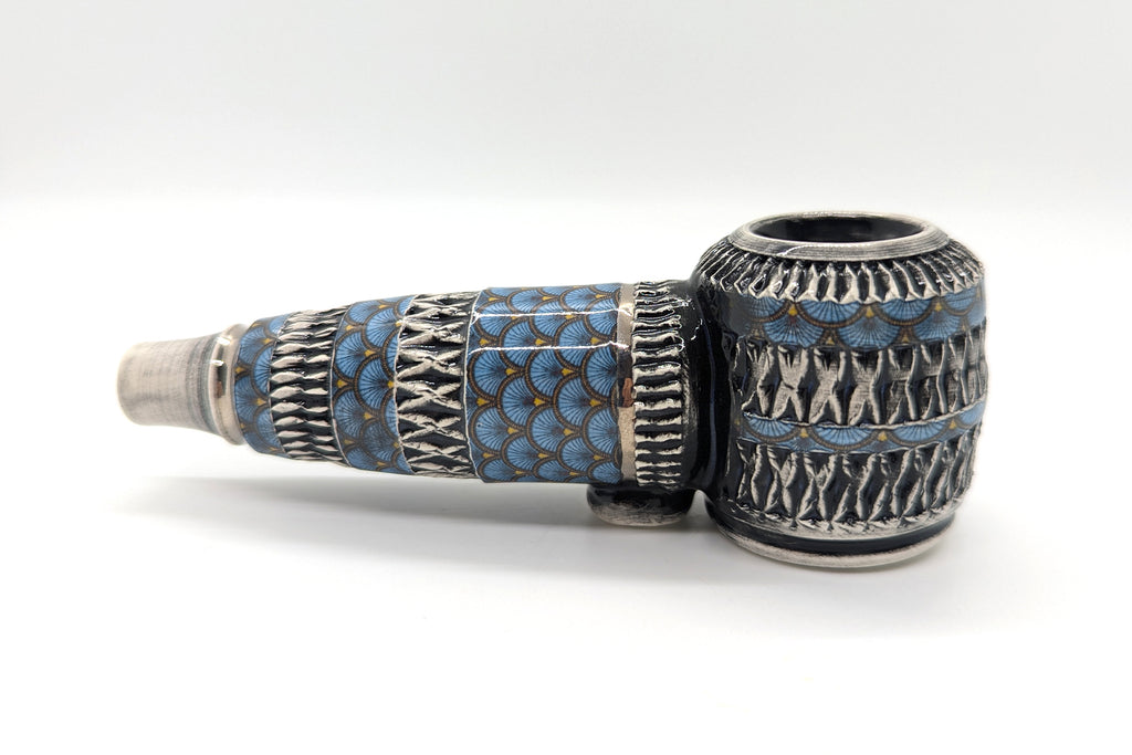 Blue Shells II is packaged with care and includes a Muslin carrying sack, HVPC decal, HVPC Pin, and a Pipe cleaning multi-tool. These pipes are made by hand using a pottery wheel and clay sourced from the USA. Designed exclusively by HVPC.