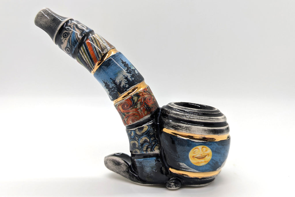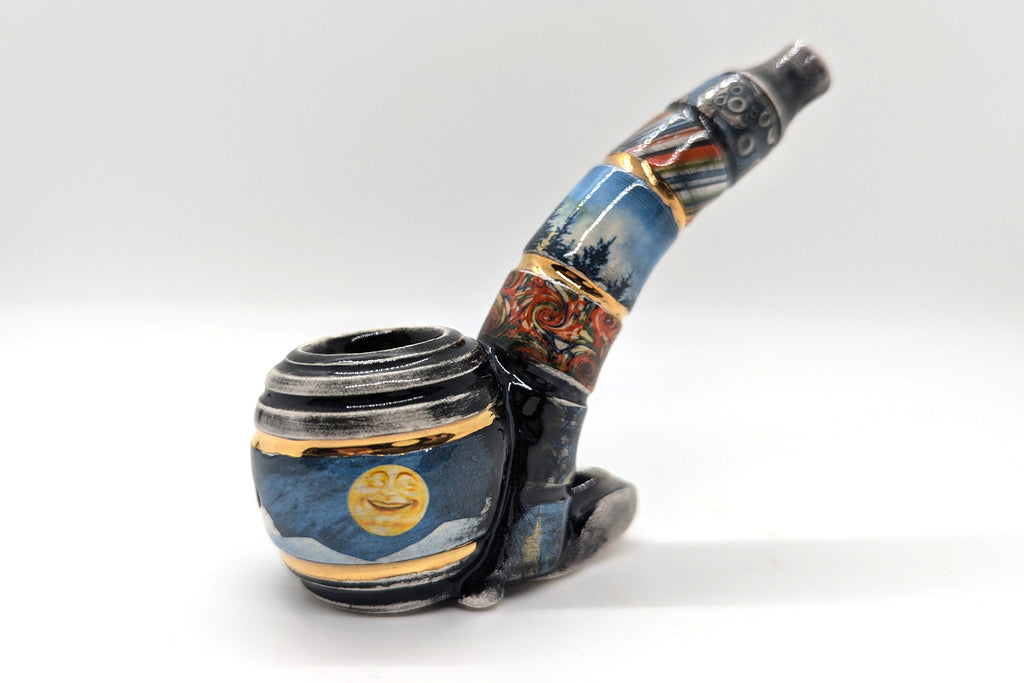 Moon Shine is packaged with care and includes a Muslin carrying sack, HVPC decal, HVPC Pin, and a Pipe cleaning multi-tool. These pipes are made by hand using a pottery wheel and clay sourced from the USA. Designed exclusively by HVPC.